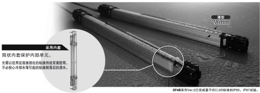 >>關于光幕傳感器使用上的注意事項 提高耐環境性能,使用更方便 [新結構] 盡可能消除接縫的無縫結構是神視的最新研發成果。筒狀內套保護內部單元。盡可能消除了單元和透鏡面等部位的縫隙(接縫),使油霧和粉塵等無法侵入,提高了耐環境性能。