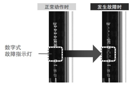 配備數字式故障指示燈,故障內容一目了然 常時檢查光幕傳感器電纜的誤配線、斷線、短路及內部電路異常或異常入光等故障。在裝置調試時如電氣系統發生故障等,將通過數字顯示方式告知故障內容。無需像以往那樣對LED的閃爍次數進行統計。