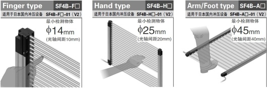 可根據使用現場的情況,從3種類型中選擇 光幕傳感器SF4B系列檢測范圍230〜1,910mm(Finger型到1,270mm)的豐富的變化。3種類型可以混合在一條直列上的連接。
