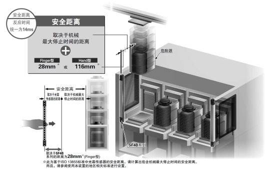 >>SF4B-03 Ver.2產品信息頁面 所有機型的反應時間統一為14ms、設計簡單 無關光軸數、光軸間距及串聯連接臺數,都能實現14ms高速反應。從而減輕了計算安全距離的工時。