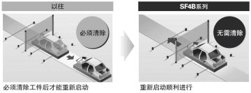 屏蔽控制中的生產線停止后,也能順利而安全地重新啟動! 配備重啟功能 即使由于工件導致光幕傳感器處于被遮光狀態,從而使電源關閉時,或在進入屏蔽前(屏蔽傳感器只有一個被遮光的狀態)生產線停止時,裝置也可順利且安全地重新啟動,無需清除遮光的工件。
