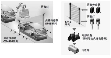 配備屏蔽控制功能,兼顧安全性和生產率 光幕傳感器本體配備屏蔽控制功能, 僅在人體通過時使生產線停止,而工件通過時則可照常運行。可將屏蔽傳感器和屏蔽燈直接與光幕傳感器連接,無需屏蔽專用控制器。低成本,且兼顧安全性和生產率。