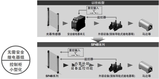 構建無需專用安全繼電器單元的安全電路 光幕傳感器本體內置安全繼電器單元的功能,可對外部設備進行監控(繼電器熔敷監視等),并具備聯鎖功能等。無需安全繼電器單元即可構建安全電路,由于能使控制柜更加小型化,從而有助于降低成本。