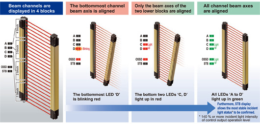 一眼就可確認入光位置的光軸對齊指示燈 光軸對齊指示燈將光幕傳感器的光軸分成4等分顯示。作為光軸的對齊基準,當底端(或頂端)的光軸對齊時,LED呈紅色閃爍。此后,光軸對齊的部分依次亮紅燈,如果所有光軸都入光則所有的LED均亮綠燈。再加上穩定入光指示燈(STB),可確保設置更加穩定。
