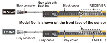 易于判別投光器和受光器 投光器為灰色,受光器為黑色,容易識別。可減少施工或維護時因誤配線或誤識別引起的故 障。而且,還可從光幕傳感器的正面確認型號。